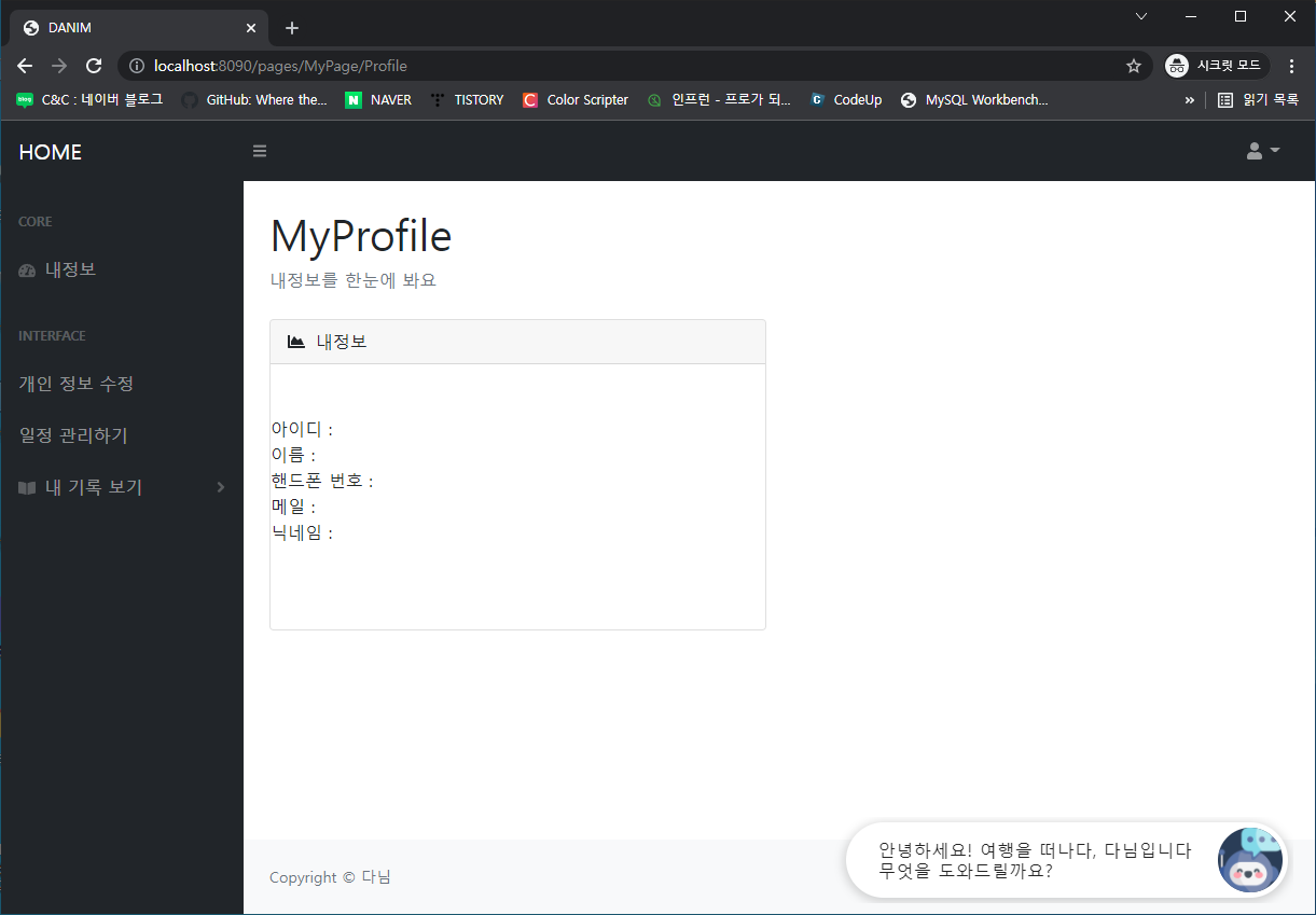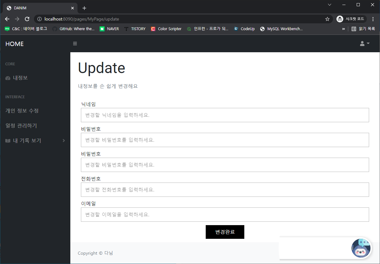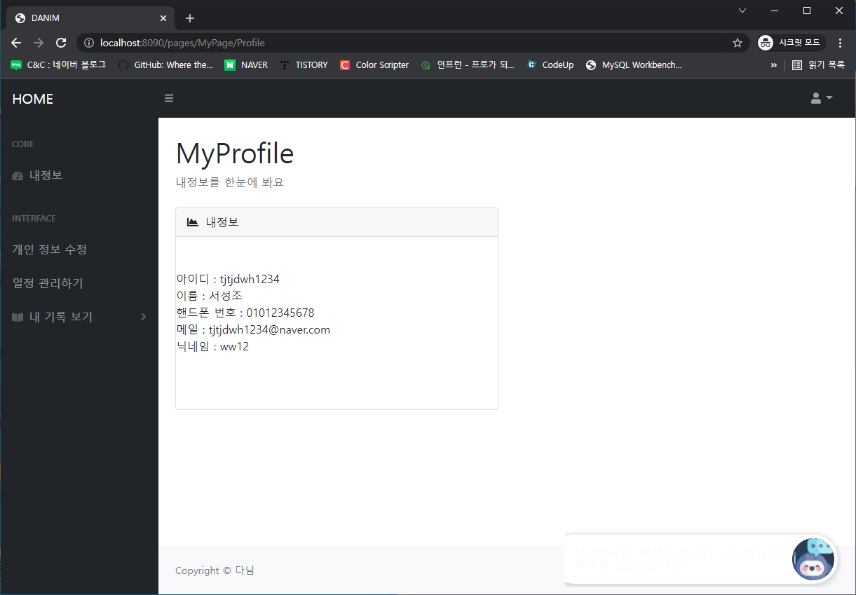 개인정보들은 시간이 너무 부족해서 로그인할 때 jstl에 값을 넣어서 반환해서 그 값을 화면에서 표시해주는 형식으로 만들었습니다. 다른 프로젝트 기능들도 많이 있고 이것저것 작성할 것들이 많이 필요한데 통폐합한다고 시작했는데 에러만 더 쌓여서 며칠 밤새고 정신없이 하루하루 보냈던 것 때문에 환기시키는 마음으로 살짝 정리하고 다음 포스팅에서 다시 정리하겠습니다. 또한 포스팅은 이전에 컴퓨터 2600 -> 5600x로 cpu 바꾼 것도 밀렸던 공부 내용들, 이전에 지난 일상들을 일상과 공부 내용 그리고 이후 파이널 프로젝트를 진행하는 내용도 모두 차근차근 다시 작성해나갈 예정입니다!