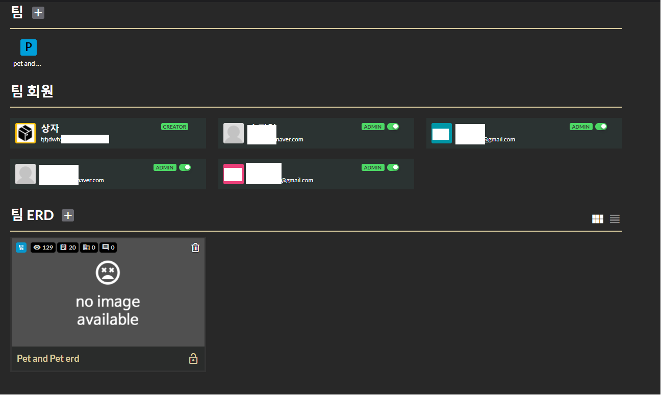 erdcloud에 있는 pet and pet은 전체 처음 프로토타입으로 팀 생성이 아닌 개인 생성으로 erd를 그린 것입니다.