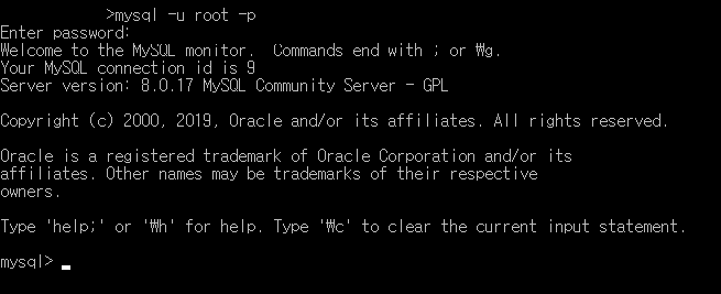 cmd창에 들어가서 mysql -u root -p를 엔터를 쳐서 진행해 주시는데 이때 root는 아이디를 의미합니다 root가 아닌 다른 아이디로 이름을 작성한 경우 다음의 형식의 mysql -u [아이디] -p에서 [아이디] 칸에 값을 넣어주시고 엔터를 입력하시면 됩니다.