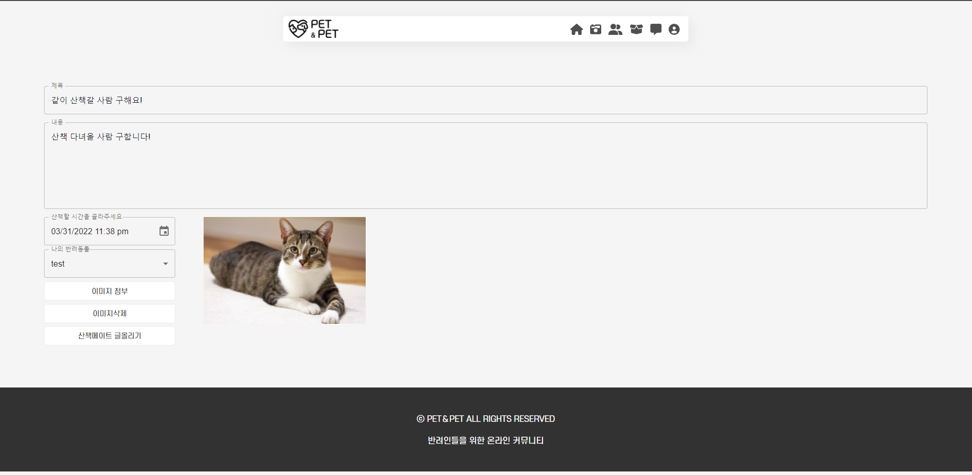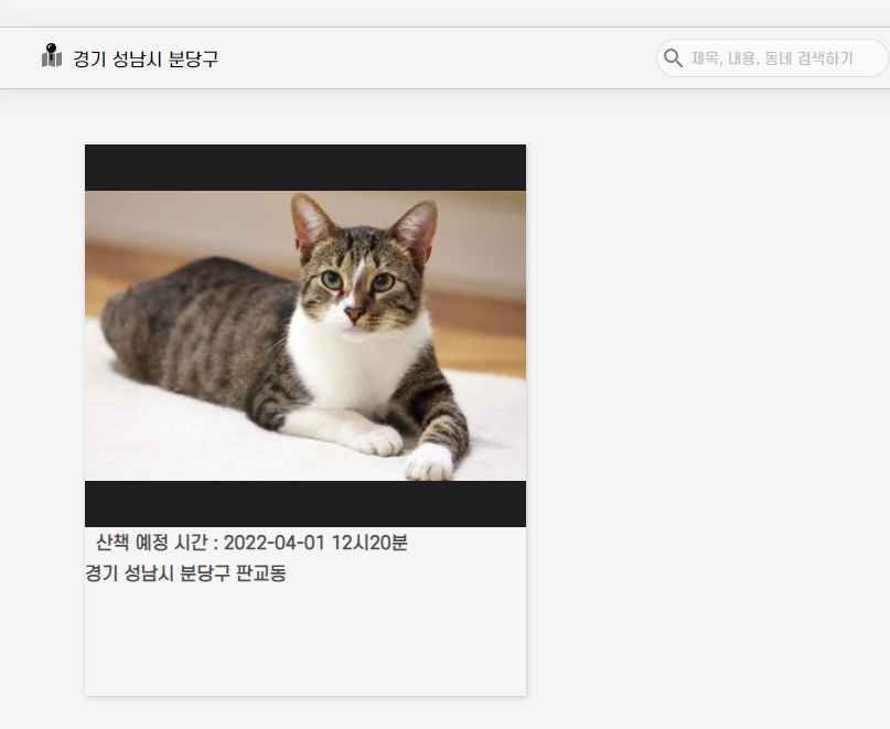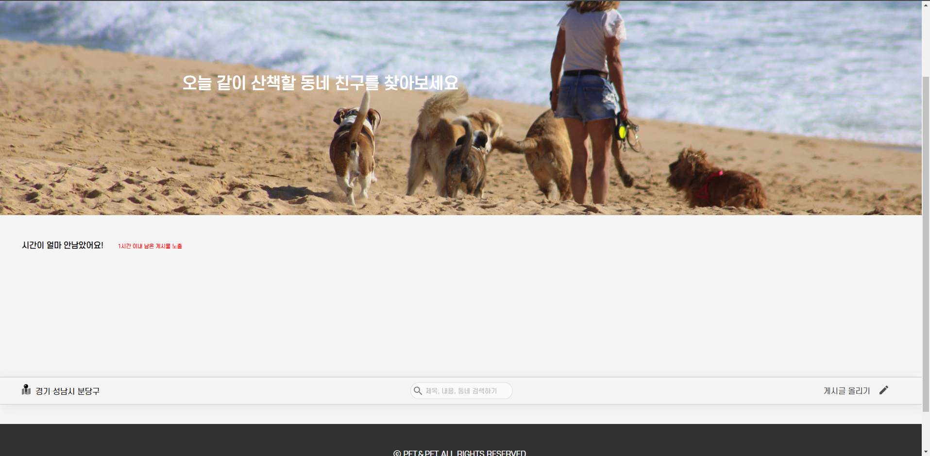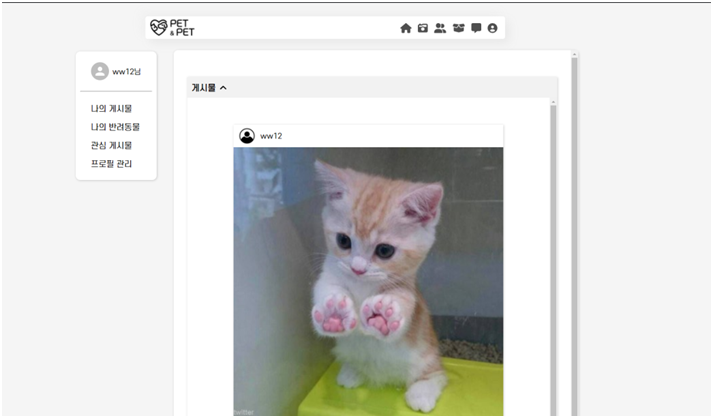 프로젝트 내용 : 꾸준히 성장 중인 반려인들을 위한 종합 온라인 커뮤니티 서비스 기획, 반려인들만의 특별화된 소셜 미디어, 지역 정보를 기반으로 근처에 있는 산책 메이트 찾기, 반려인들 간의 중고 거래를 이어주는 중계 플랫폼이 종합된 프로젝트입니다.