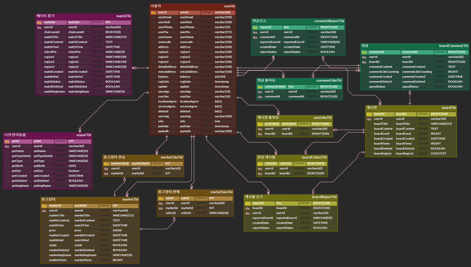 구성 테이블은 사용자, 메이트 찾기, 댓글 신고, 댓글 좋아요, 게시판 좋아요, 관심 게시판, 게시물 신고, 댓글, 게시판, 중고장터 관심, 중고장터 판매, 중고장터, 나의 반려동물 테이블로 나눠졌습니다.