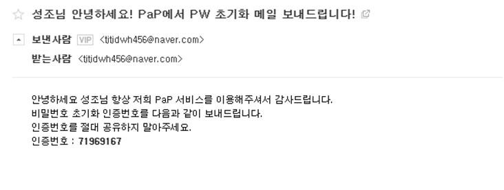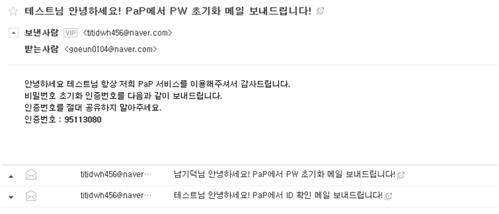 PW 찾기를 진행하면 회원가입 시 입력한 이메일로 랜덤 한 인증번호를 발송하며, 이 인증번호를 기반으로 ID, Email, 인증번호, 새로운 비밀번호, 새로운 비밀번호 확인을 모두 입력하면 패스워드가 새로운 비밀번호로 변경됩니다.