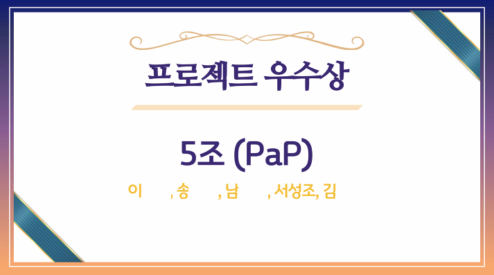 교육받던 국비교육에서 프로젝트 종합 발표 중 나름 좋은 성적을 남길 수 있을 만큼 잘 마무리 지을 수 있었던 것도 너무 다행이고 만족스러운 프로젝트였다고 생각됩니다.