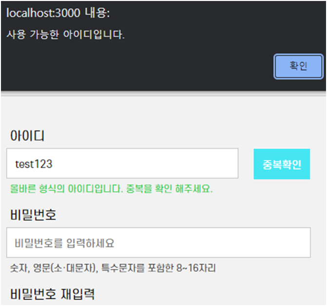아이디, 닉네임, 이메일 3가지는 모두 중복 확인 버튼을 클릭하면 Database에 값이 있는지 확인하고 있다면 사용 불가능 없다면 중복이 없으므로 사용 가능한 값이라고 alert 문을 띄워줍니다.