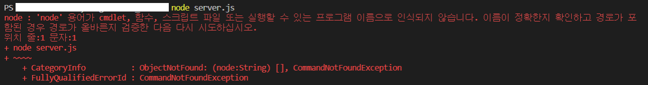 만약 Node.js를 설치하지 않았다면 위와 같이 에러가 발생한다.