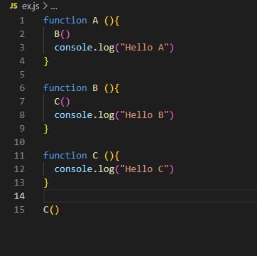 "Hello A"가 출력된 후 B 함수를 호출했다. 이후 "Hello B" 문자 출력 후 C 함수를 호출하여 출력하게 됐다.