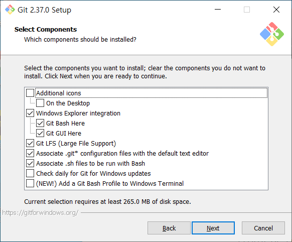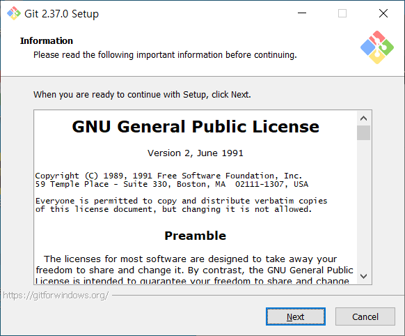설치 파일을 다운로드 받고 실행하면 다음과 같은 Git 2.37.0 Setup의 약관이 나온다.