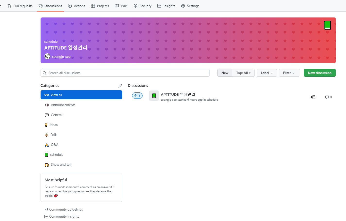 이번에 APPETIZER 글로벌 홍보 서포터즈 중에 개발 1팀 활동을 위해서 GitHub로 산출물 관리를 하려 했습니다. 그런데 일정 관리와 회의 기록을 기록하고자 하는 과정속에 이슈로 기재 또는 브랜치로 작성하는 것은 너무 비효율 적이라는 판단이 들어서 이것저것 알아보던 중 Discussion이라는 기능이 있어서 그 기능을 사용해 보니 너무 좋은 것 같아서 작성 및 정리를 진행하려 합니다!