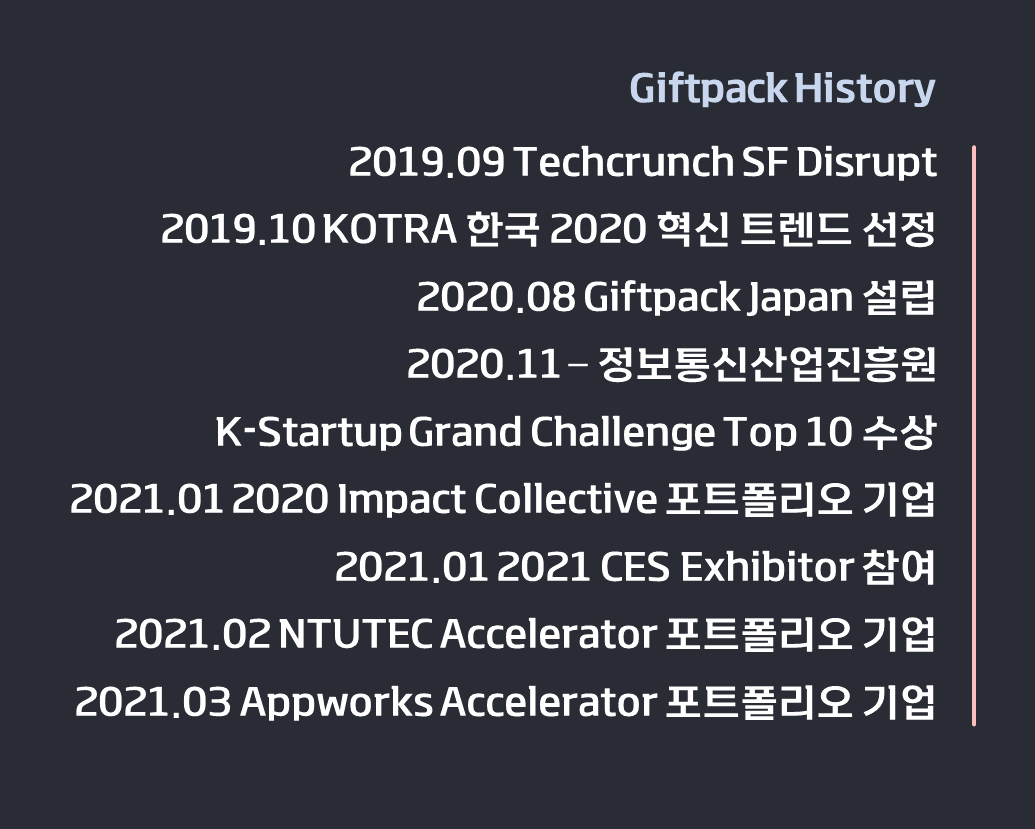 Giftpack의 개인 누적 사용자 수는 현재까지 약 7,400명과 20개 이상의 기업 고객들로 구성되어 있습니다!