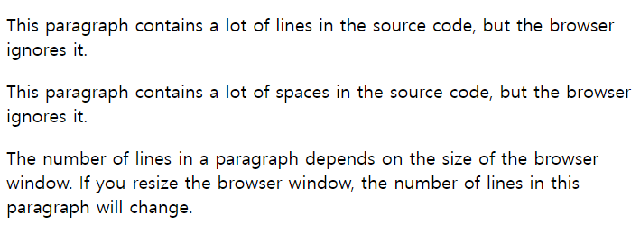 p태그에 내용만 입력해서 사용하는 경우. 브라우저는 자동으로 띄어쓰기를 해주지 않기 때문에 위와 같이 사용하더라도 줄이 바뀌거나 공백이 다음과 같이 발생되지 않는다.