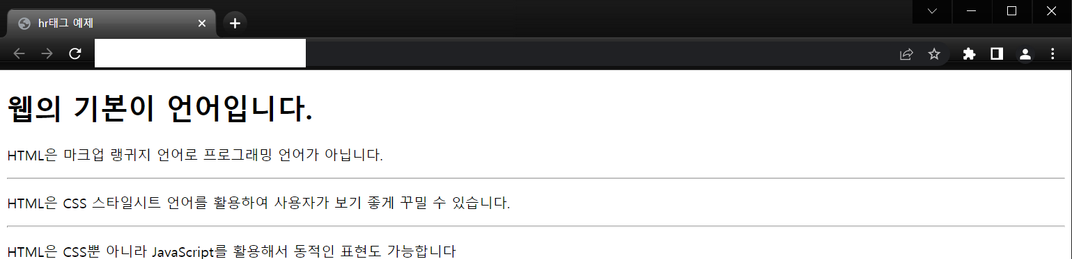 위 예제와 같이 줄을 바꿀 때 사용하게 되는데 <hr> 태그를 입력하게 되면 수평 줄을 삽입한다는 의미가 된다.
