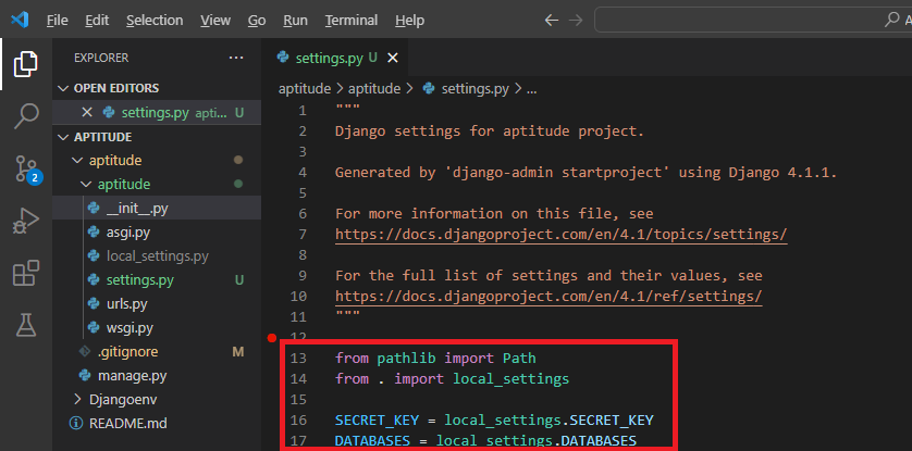 local_settings.py의 값이 모두 설정됐으면 settings.py로 와서 다음과 같이 작성한다.