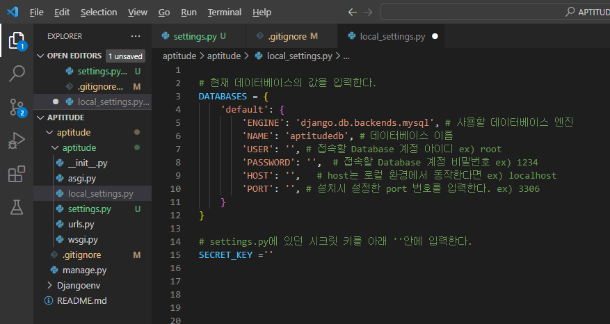 본인은 gitignore에 있는 local_settings라는 파일 이름을 활용하여 mysql 세팅 값과 secret key를 빼서 작성해 보려 한다.