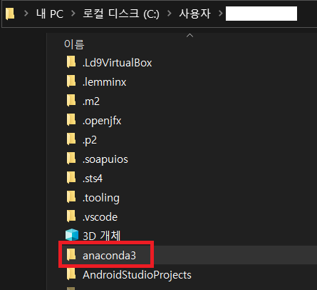 anaconda3가 설치된 폴더를 찾는다. 이 경로를 복사한다.
