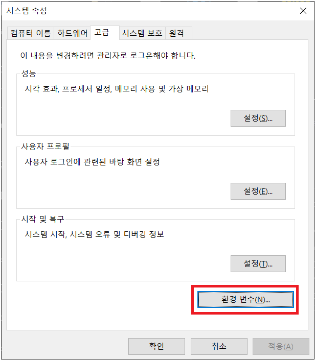 고급 시스템 설정을 누르면 다음과 같은 시스템 속성이 나온다. 환경 변수를 클릭한다.