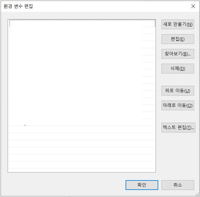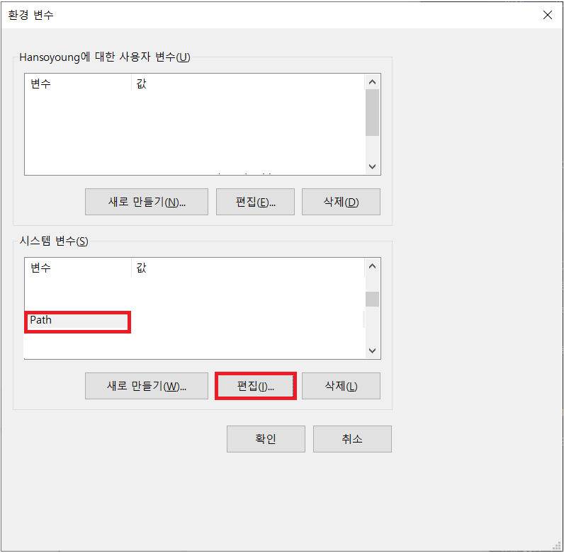 Path를 클릭 후 편집을 누른다. 환경 변수 편집 창에서 환경 변수를 편집한다.