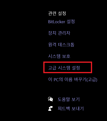 설정 정보에서 다음의 고급 시스템 설정을 누른다.