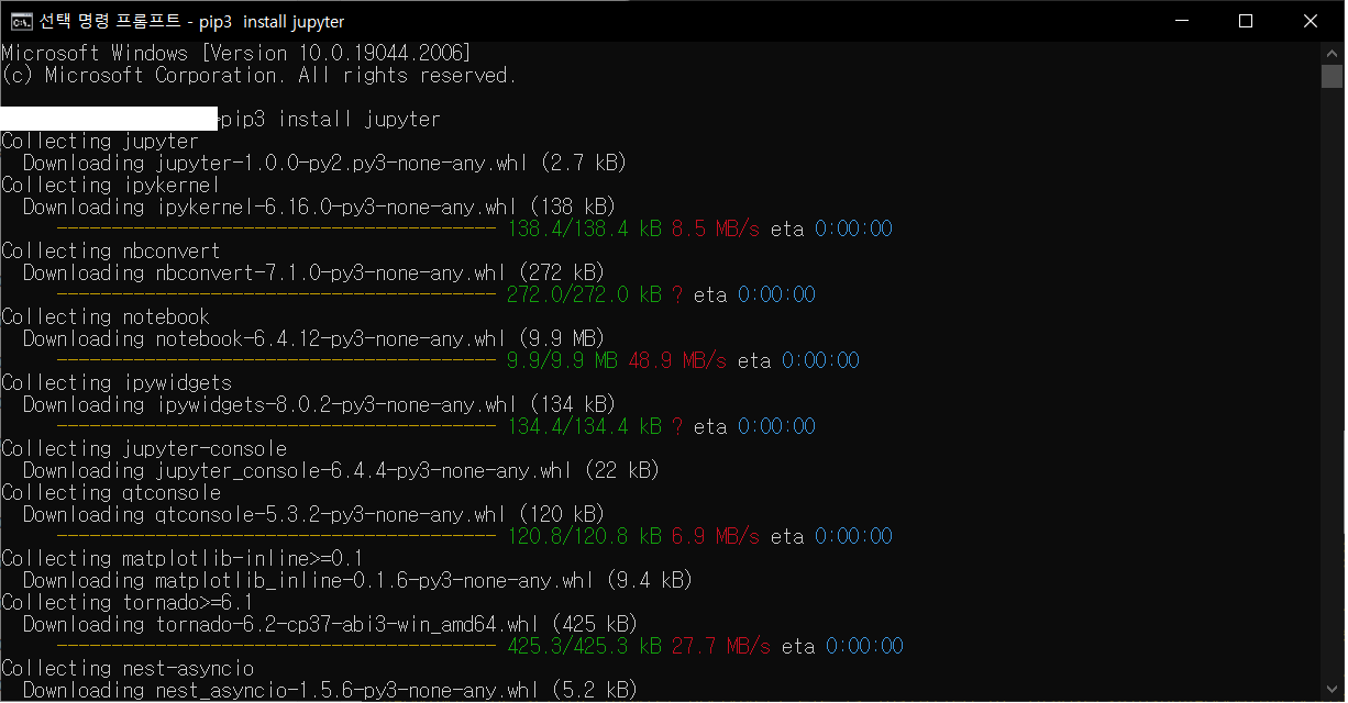 cmd 창에 pip3 install jupyter를 입력 및 코드 실행한다.