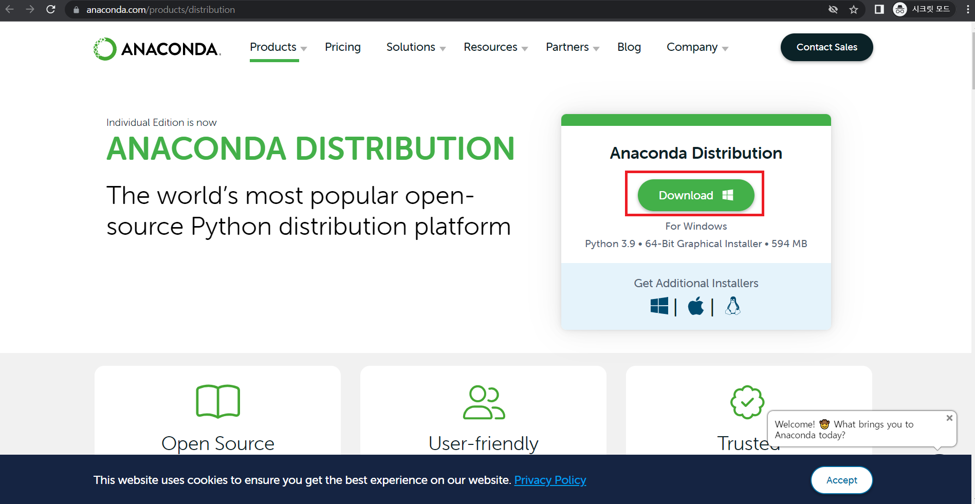다운로드를 누르면 다음과 같이 Anaconda가 나온다.
