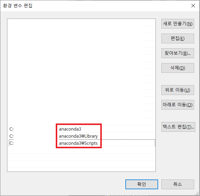 이후 아나콘다 환경 변수 설정을 위해 다음과 같이 진행한다.