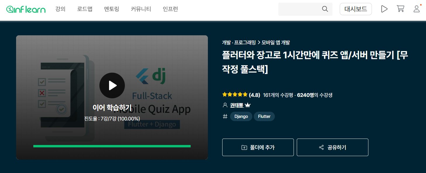 [무료] 플러터와 장고로 1시간만에 퀴즈 앱/서버 만들기 [무작정 풀스택] - 인프런 | 강의