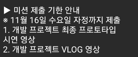 앞서 언급한 내용을 읽어주셨을지 모르겠지만 개발 Vlog와 ppt 제작과 발표를 같은 팀원 미정이가 저는 프로토타입 시연에 필요한 개발 진행을 맡기로 했었습니다. 그런데 원래 일정에 대해서 첫 공지로 기억하고 있던 18일이 아닌 16일로 변경됐던 사실을 다시 확인하게 됐습니다😥