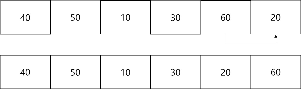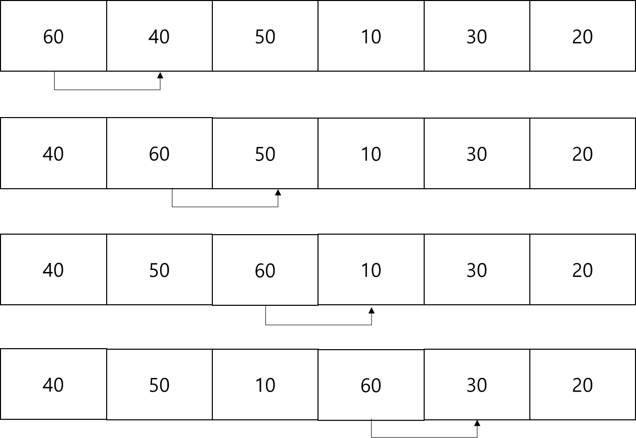 [40, 50, 10, 20, 30, 60] -> [40, 50, 10, 20, 30, 60] (변경된 상태의 40과 50을 비교했는데 40이 50보다는 작아서 그대로 둔다.