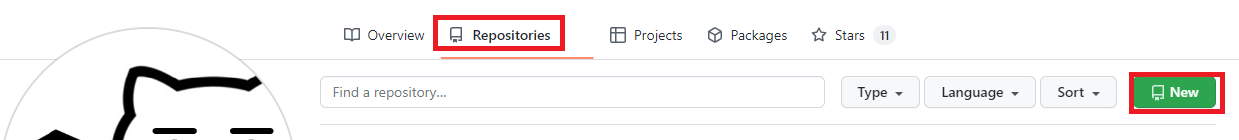 2. Repositories를 누르고 New 버튼을 클릭해서 저장소를 생성하는 방법이다.
