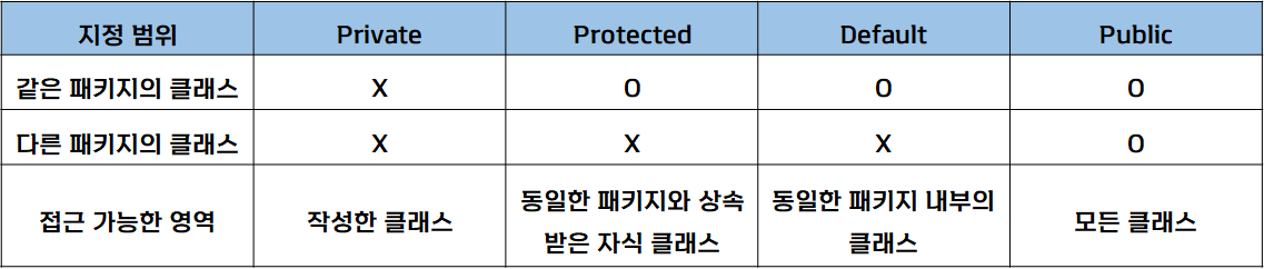 자바에서 클래스, 변수, 메서드, 생성자에 대한 접근을 제한하거나, 제어하기 위해서 사용하는 키워드이다.