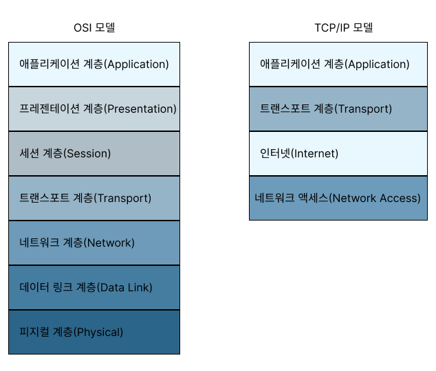 OSI 모델은 물리 계층(Physical)에서 시작해 애플리케이션 계층까지 총 7 계층으로 나뉘며, TCP/IP 모델은 4개의 계층으로 구성되어 있으며, 다음 이미지와 같은 레이어 층을 가지게 되는데 참고해 주시면 좋을 것 같습니다.