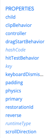 SingleChildScrollView 생성자는 다음 옵션들외에 다양한 옵션을 제공하지만, 자주 볼 수 있는 옵션은 다음과 같다.